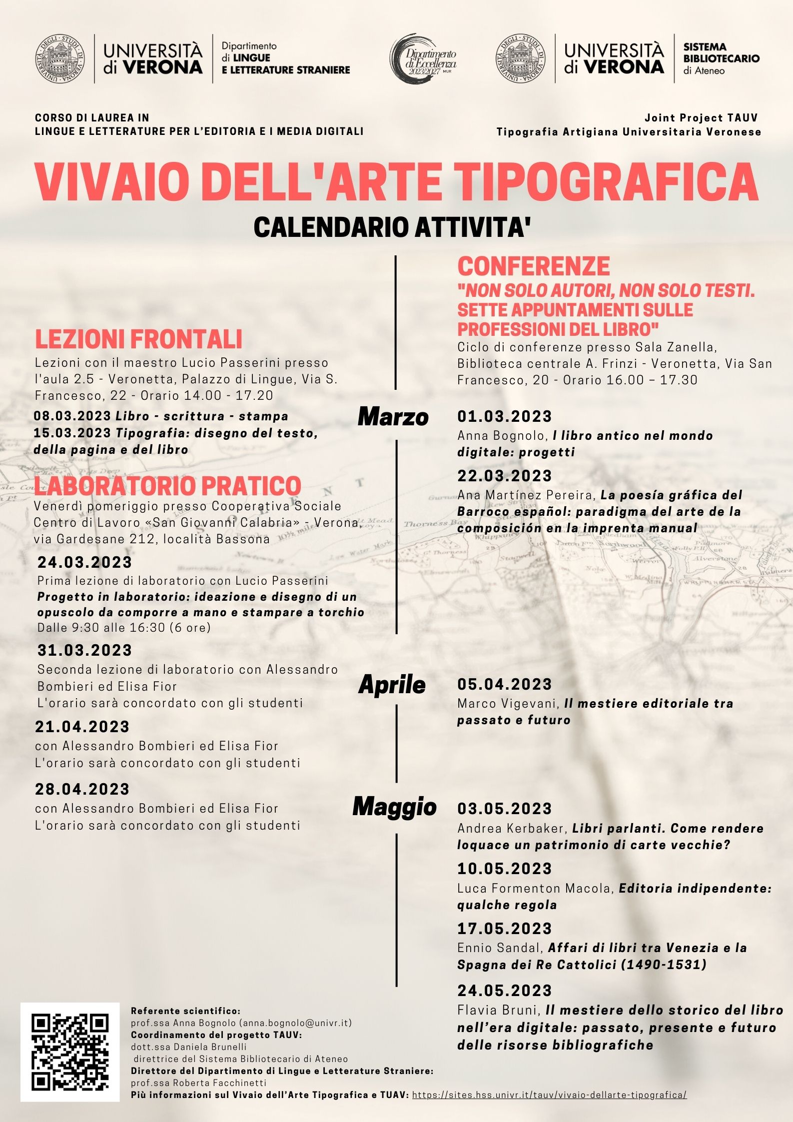 Il tirocinio è riservato al CdS in Lingue e Letterature per l’editoria e i media digitali, curriculum “Editoria”. Prevede un percorso formato da 12 ore di lezioni teoriche di progettazione editoriale con il prof. Passerini (relazione); un ciclo di 6 Conferenze “Non solo autori, non solo testi. Sei appuntamenti sulle professioni del libro” marzo -maggio 2023 (relazione); il percorso culmina nel Laboratorio pratico con 24 ore di attività laboratoriali, che permetteranno di produrre un libro mediante un processo di stampa manuale.