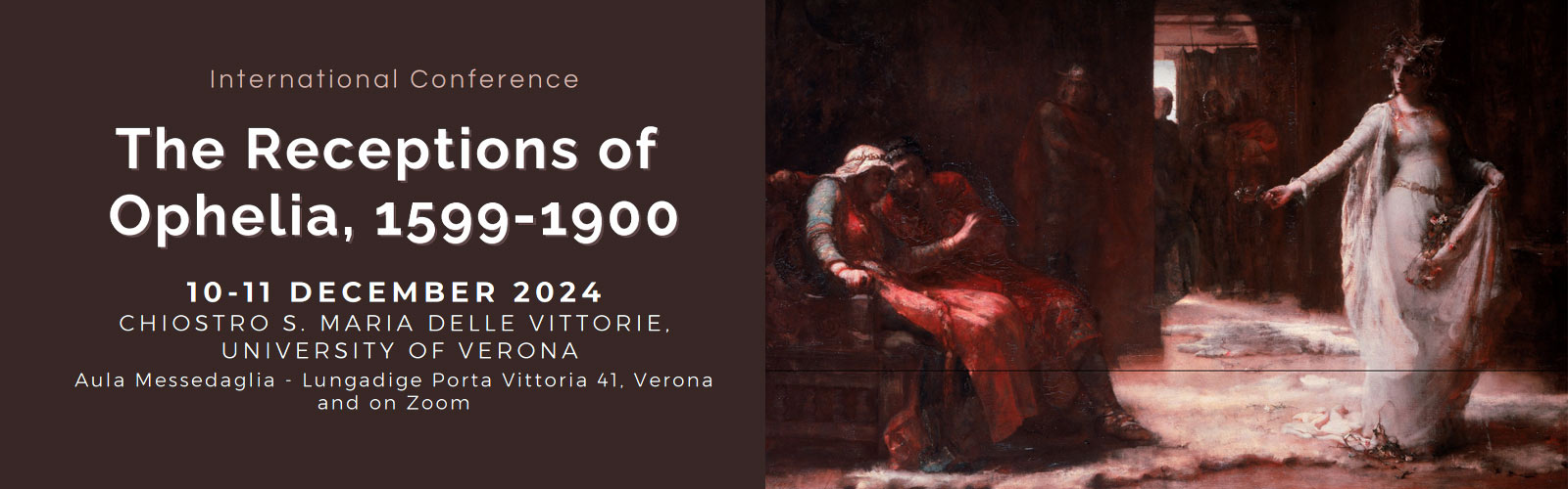 The International Conference "The Receptions of Ophelia, 1599-1900", organised by Prof. Emanuel Stelzer, wishes to investigate from an interdisciplinary point of view the literary and cultural receptions of Ophelia from the original early modern context to the end of the nineteenth century. The conference stems from the subproject "Accessing Ophelia" within the "Inclusive Humanities" Project of Excellence of the Department of Foreign Languages and Literatures (Verona University). The conference is taking place in the Chiostro S. Maria delle Vittorie as well as on zoom. To request any information and in order to obtain the Zoom link, please write to emanuel.stelzer@univr.it