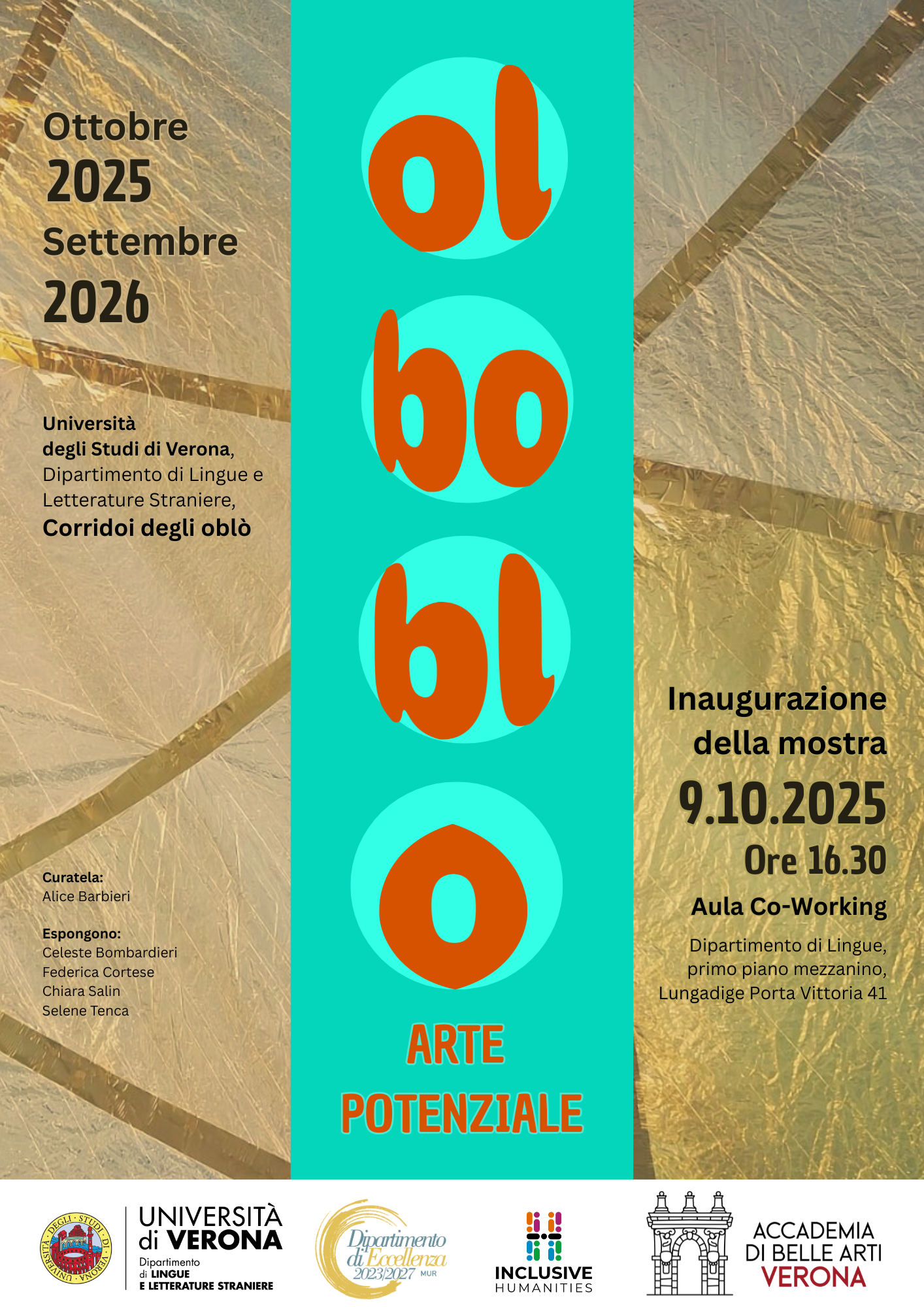Apre ufficialmente giovedì 9 ottobre 2025 la seconda edizione della mostra OLBOBLO. Arte potenziale. L’esposizione, frutto di un accordo fra l’Accademia delle Belle Arti di Verona e il Dipartimento di Lingue e Letterature Straniere all'interno del Progetto di Eccellenza “Inclusive Humanities”, sarà ufficialmente inaugurata giovedì 9 ottobre in Aula Co-Working (Dipartimento di Lingue e Letterature Straniere, primo piano mezzanino) dalle ore 16.30.