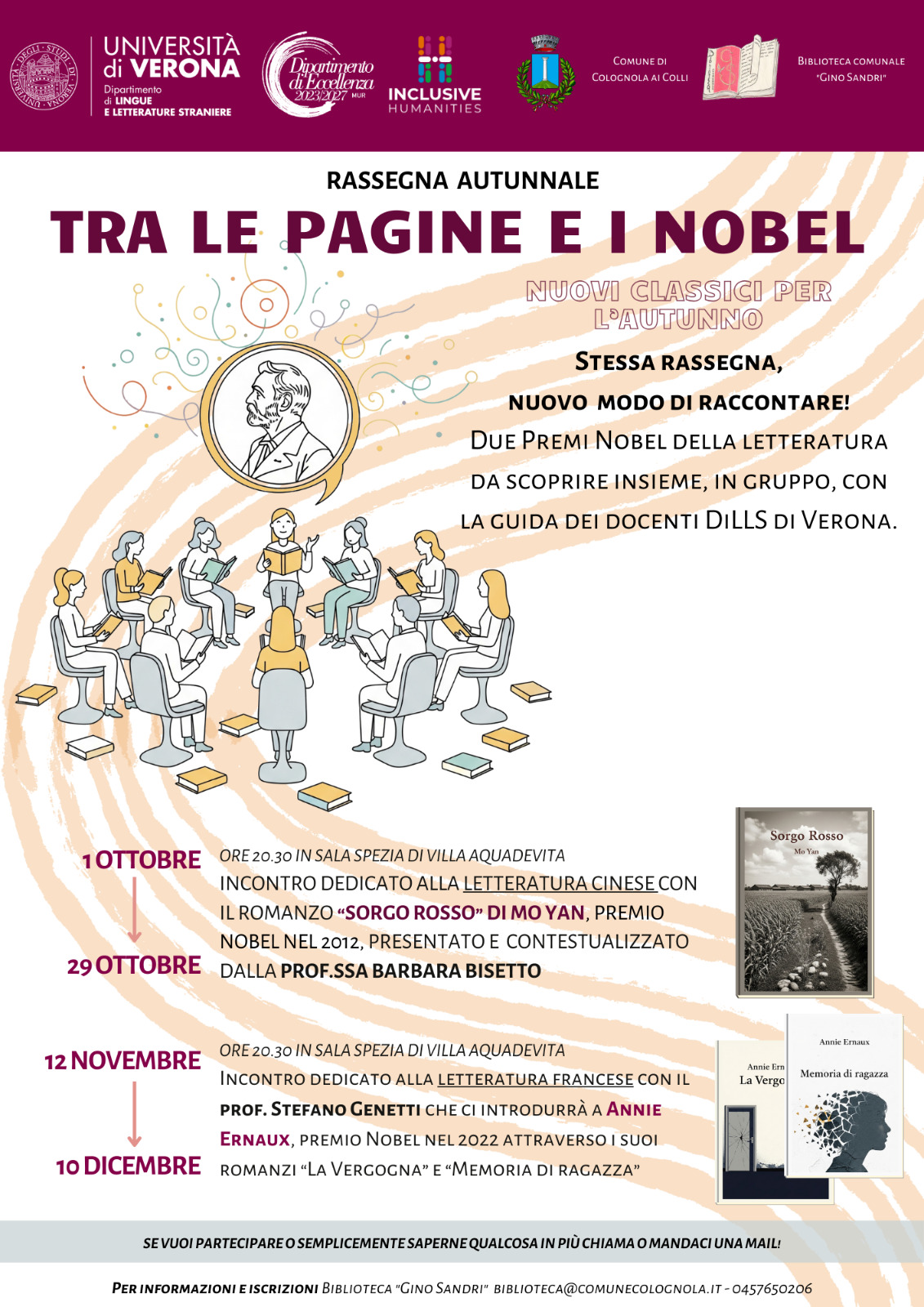 Ciclo di presentazione e discussione di classici della letteratura cinese (Mo Yan, Sorgo rosso) e francese (A. Ernaux) per accompagnare i partecipanti dei gruppi di lettura di Colognola ai Colli alla scoperta di testi di autori premiati con il premio Nobel per la letteratura.